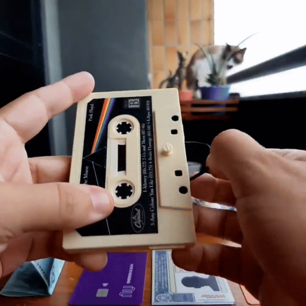- É isso mesmo: uma carteira feita a partir de fita cassete original, transformada à mão em um acessório cheio de personalidade. Recebe um adesivo vinil com impressão UV e serve perfeitamente pra guardar seus cartões e notas. Um pedacinho dos anos 80/90 que cabe no seu bolso.